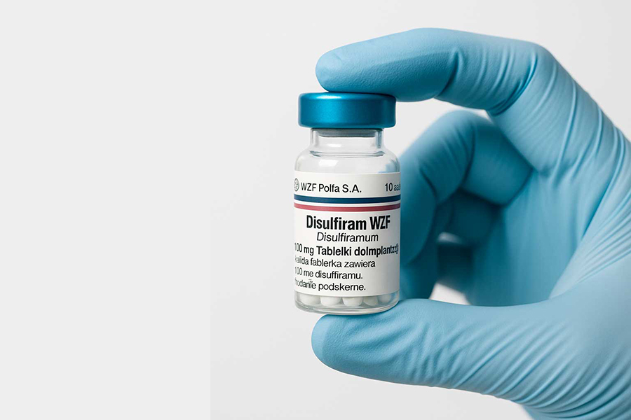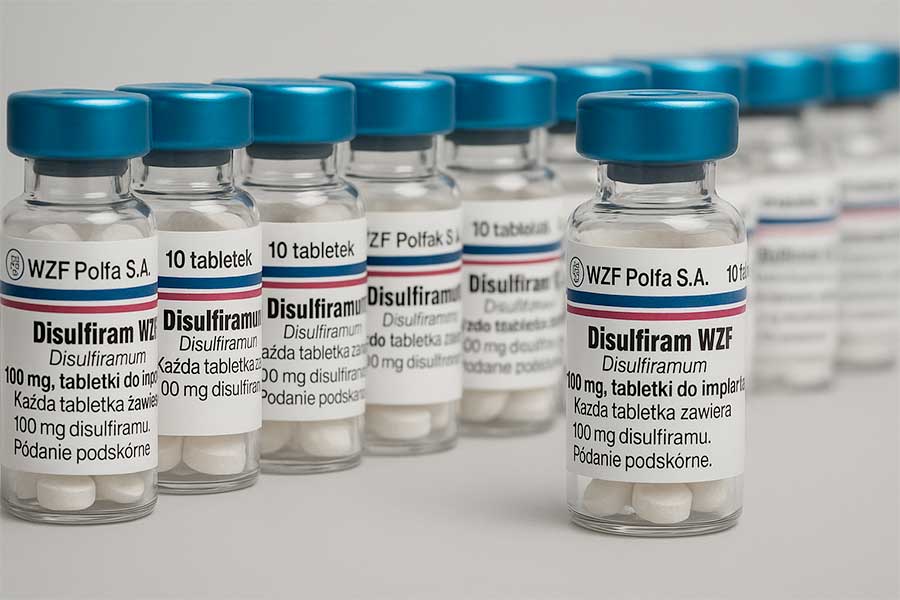 Podskórnie umieszczono zestaw jałowych tabletek disulfiramu, które stopniowo uwalniają substancję czynną do tkanek i krwiobiegu.