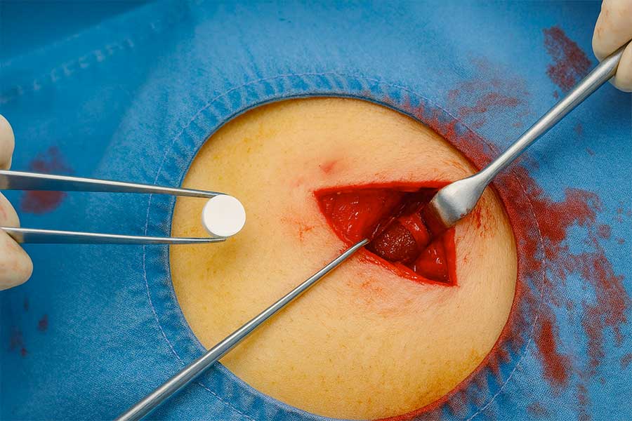 Lekarz wykonuje niewielkie nacięcie skóry (zwykle 1–2 cm), a następnie wprowadza pod skórę: